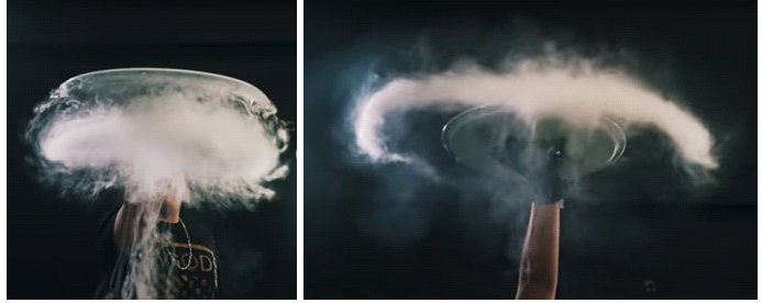 Further, a single rise in the smoke of an asymmetric aerodynamic profile in the form of a hemisphere with a large streamlining in the direction of travel was studied. During the rise of the hemisphere, a process is observed, the same as the rise of the plate - an annular vortex with an upward flow resembling a mushroom. And when the hemisphere stops at the top point, the flow hitting it from below is reflected not to the sides, as in the case of the plate, but downward, which is facilitated by the shape of the hemisphere. In many ways, this resembles a jet stream flowing from a rocket nozzle. You can see these processes using the simplest experiments - dangling a mug in a bucket of water or a spoon in soup.