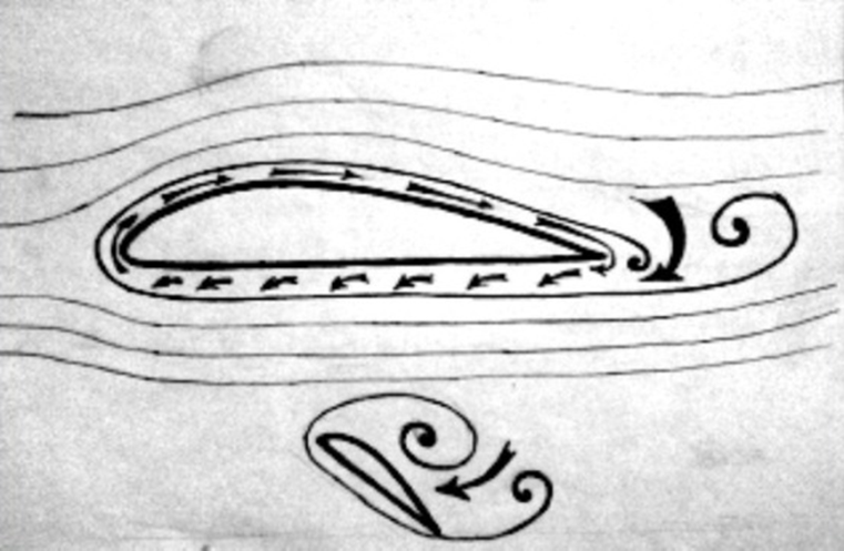 Between these two vortices, air moves under the wing from the space above it, as evidenced by the circulation of the boundary layer around the wing. Boundary layer air above the top surface bends around the trailing edge and enters under the wing. Therefore, the mushroom, like an annular vortex, has an asymmetric, curved arc, in which the leg is bent upward. The air injected under the wing moves against the flight in the boundary layer, and is the cause of the counterflow at the leading edge of the wing. Because of this, the stream of smoke in the aerodynamic tube seeks to bypass the wing from above to the last, even when it is displaced to the very bottom.